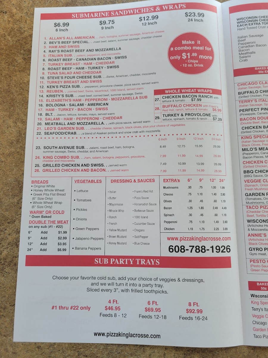 Located at 2915 East Ave S, La Crosse, WI, Pizza King La Crosse is a culinary gem celebrated for its robust offerings and welcoming atmosphere. The menu features a delightful array of pizzas, ready to be enjoyed fresh out of the oven or as take-and-bake options, ensuring convenience without compromising taste.